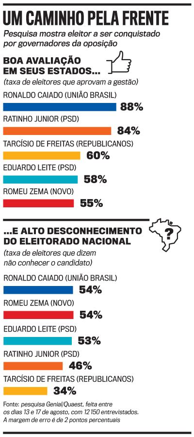 O universo de votantes a ser conquistado é bastante significativo, segundo a última pesquisa Genial/Quaest. O governador de Goiás, Ronaldo Caiado (União Brasil), por exemplo, é o mais bem avaliado entre os eleitores, com 88% de aprovação de sua gestão, mas seu nome não é conhecido por mais da metade (54%) do eleitorado nacional. Outro bom exemplo é Ratinho Jr. (PSD), do Paraná, que tem 84% de aprovação, mas é desconhecido por 46% dos eleitores brasileiros. Em diferentes graus, o mesmo se repete com os outros nomes testados, como Romeu Zema (Novo), de Minas Gerais, e Eduardo Leite (PSD), do Rio Grande do Sul. Mesmo Tarcísio de Freitas (Republicanos), de São Paulo, que já foi ministro da Infraestrutura no governo Jair Bolsonaro, não é conhecido por um terço do eleitorado do país (veja o quadro).